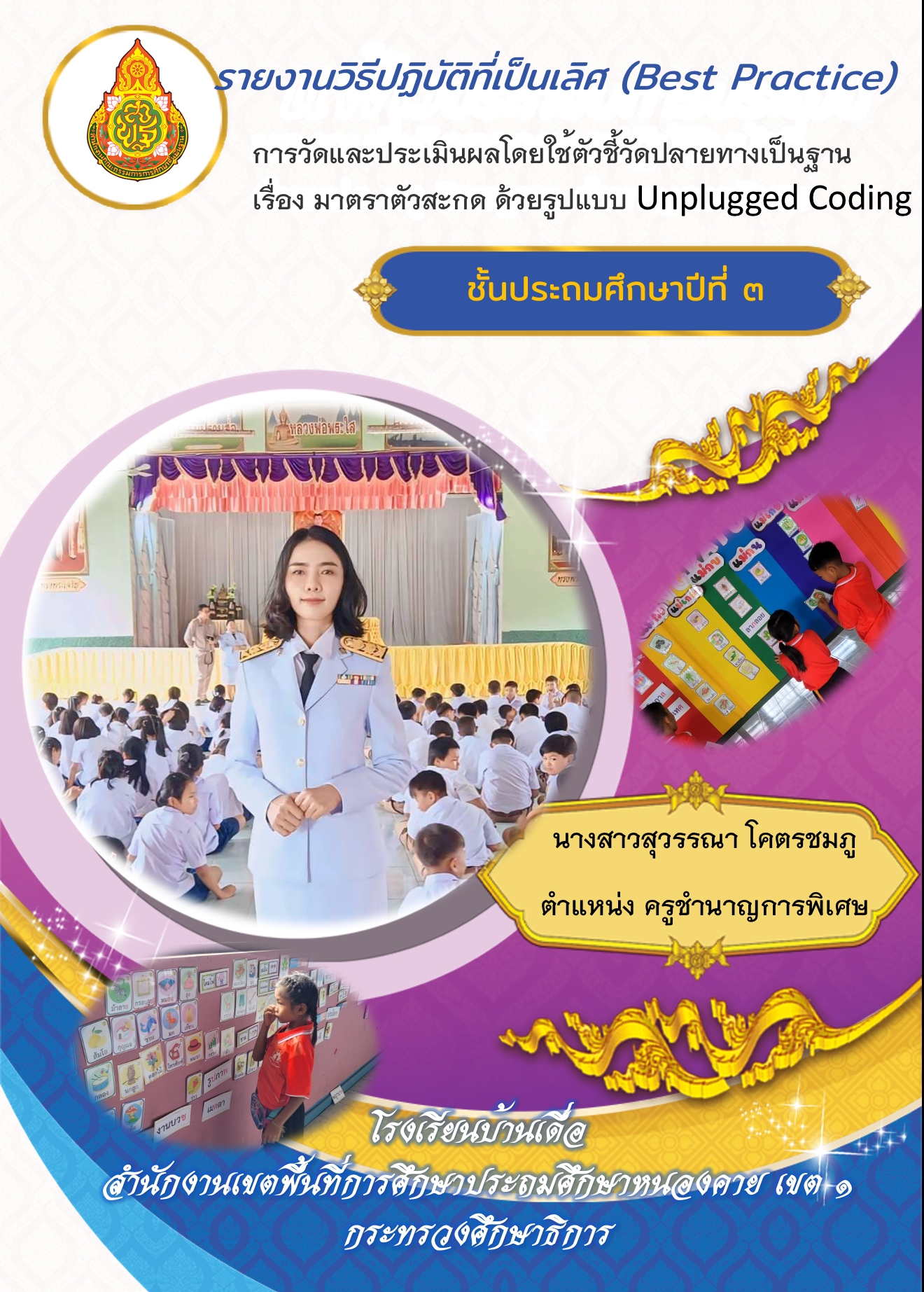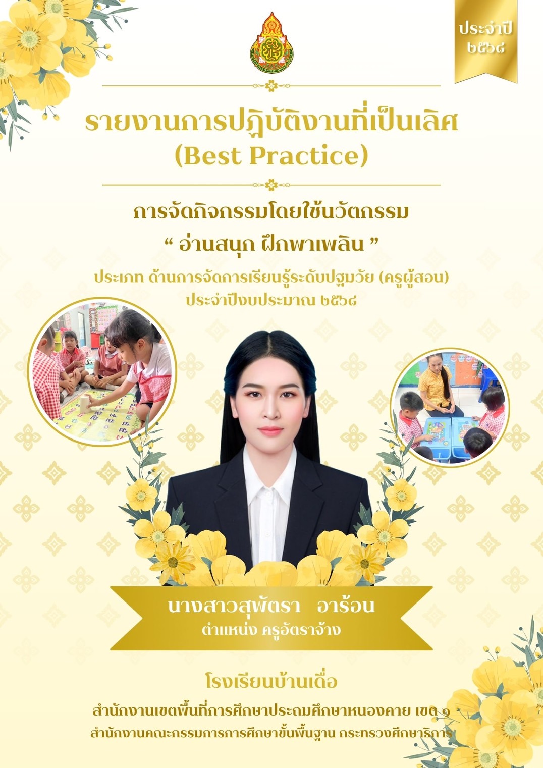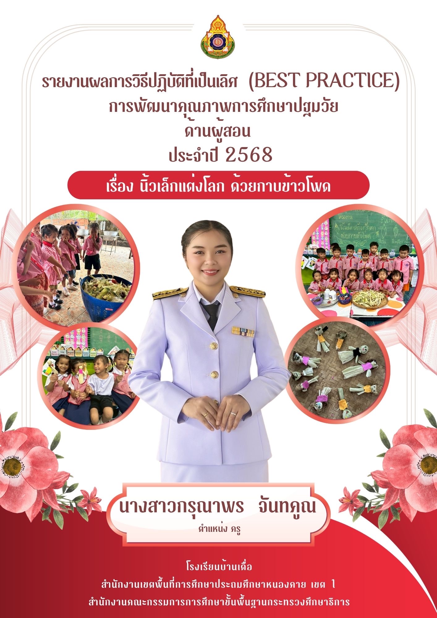 รายงานผลการวิธีปฏิบัติที่เป็นเลิศ (Best Practice) การพัฒนาคุณภาพการศึกษาปฐมวัย ด้านผู้สอน ประจำปี 2568 เรื่อง นิ้วเล็กแต่งโลก ด้วยกาบข้าวโพด นางสาวกรุณาพร จันทคูณ ตำแหน่ง ครู